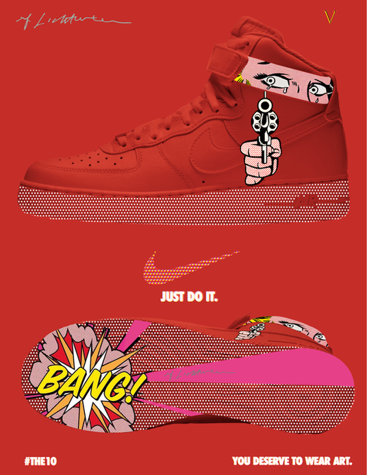 "The 10" collection will be displayed throughout ten individual rooms. Each work of art will be displayed in its own uniquely personalized room. The Roy Lichtenstein (Composition V) shoe will be suspended as the center point above stacks of newspapers and comics in the encased red room. Works by Lichtenstein are to be installed ascetically on the walls, as seen in the rendering below, to inform the viewer of the connection between the historical artists and the shoes I designed, as well as create a frame for the artwork.